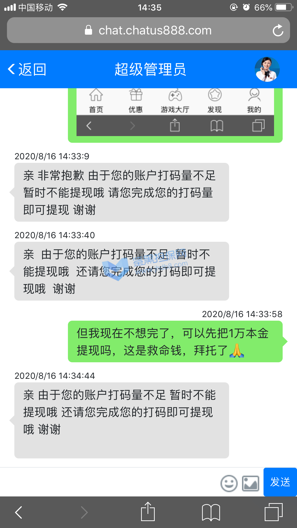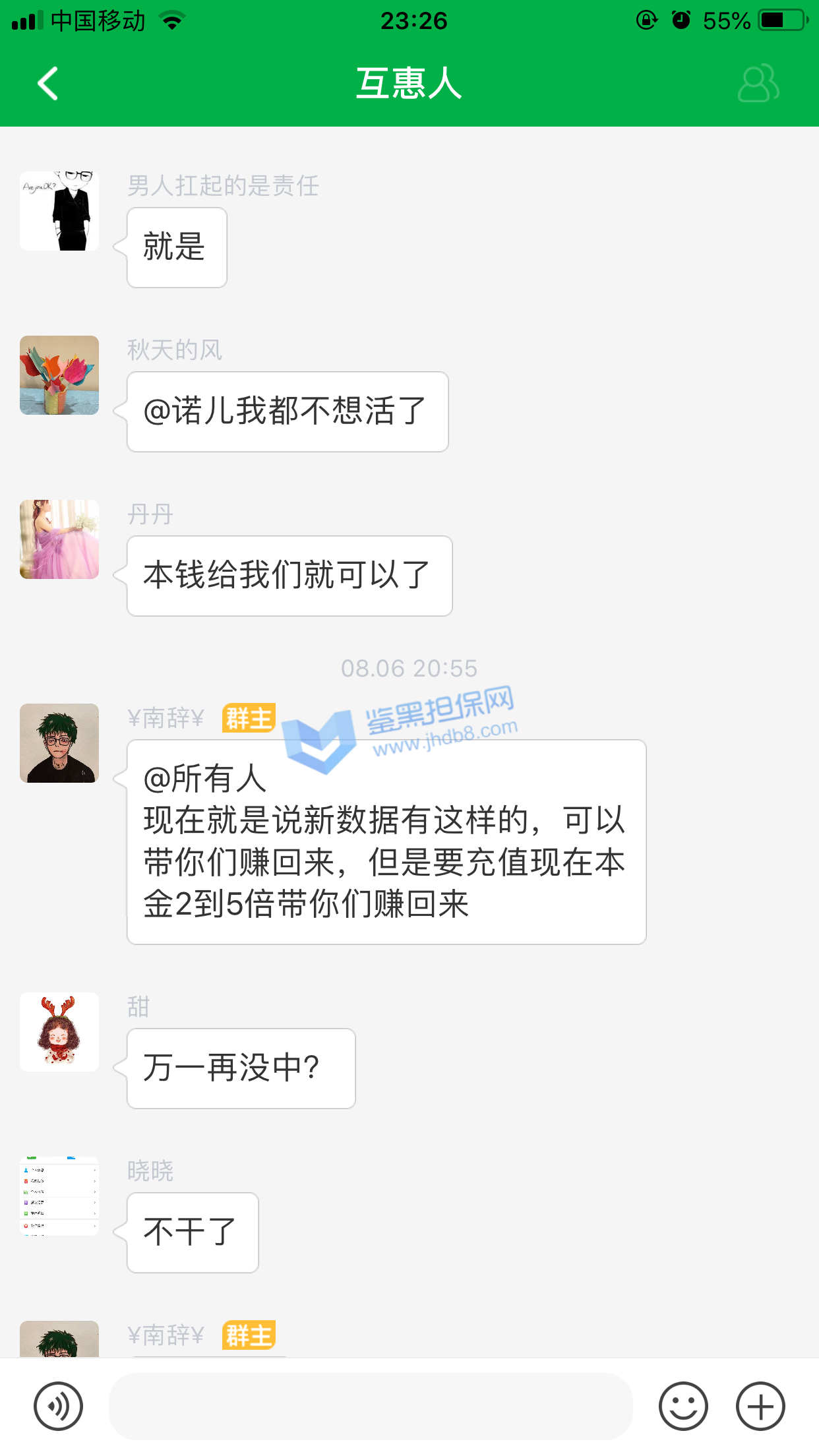 我2020年8月2日被拉进一个掌嗨群,群名叫《互惠人—初级》,群里包含群主一共有4个管理员带着我们在一个名叫《米多宝》的衔接网站下注5分快3,除开管理员,群里人数最多的时候有119个人左右,一天可以操作3次,操作时间分别为下午1点,下午5点,晚上9点,操作时间偶尔会有变动,管理员让我们怎么操作我们就怎么操作、其中我的管理员是群主,8.2号—8.5号我按照群主说的操作一共赢了1500元左右,8.6号群主说有福利数据,充值多少赚多少,赚钱之后分红一半给他们公司,当时说的名额一共有36个,直到8.6号晚上7点半了才操作完几个,剩下的全被拉进一个小群,群名叫《互惠人》,群里包含群主和管理员一共有29个人,除开群主和管理员有27个人,群主让我们一起按照他说的操作,我按照他说的操作了,结果没有中奖,输了1万,而且群里所有人都没中奖,8.7号—8.10号我又按照群主说的操作一共赢了2200左右,8.11号群主又说有福利数据,充值多少赚多少,我又充值了一万进去,心想着多赢点,把8.6号亏损的赚回来,充值成功之后群主又说让我先转6000分红给他他才带我操作,我没钱了没转给他他就没带我操作,后来我说我不做了,我想把本金提现出来,群主说必须要按照他说的操作,完成打码量之后才能提现,问米多宝客服也是说必须要完成打码量之后才能提交出款,耗了一个多小时,群主又说只有等第二天操作普通数据之后才能把1万本金提现了,第二天上午11点左右我进掌嗨群一看,群就被解散了,我去问群主,群主说的没事的,等公司给他新群和新数据之后就可以进新群操作了,最迟当天晚上或者第二天就会有新群和新数据,我慌了就反复多问了他一下,他就不是很耐烦了,然后从他回复我的信息里我就看出来以后不会有什么新群和新数据了,后来直到现在我联系他,他都没回我信息,偶尔回复一下也是说只有让我先转6千给他,他才带我操作的那种数据,就这样我一共被骗了16300元。希望鉴黑担保网帮帮我,这是急用钱。