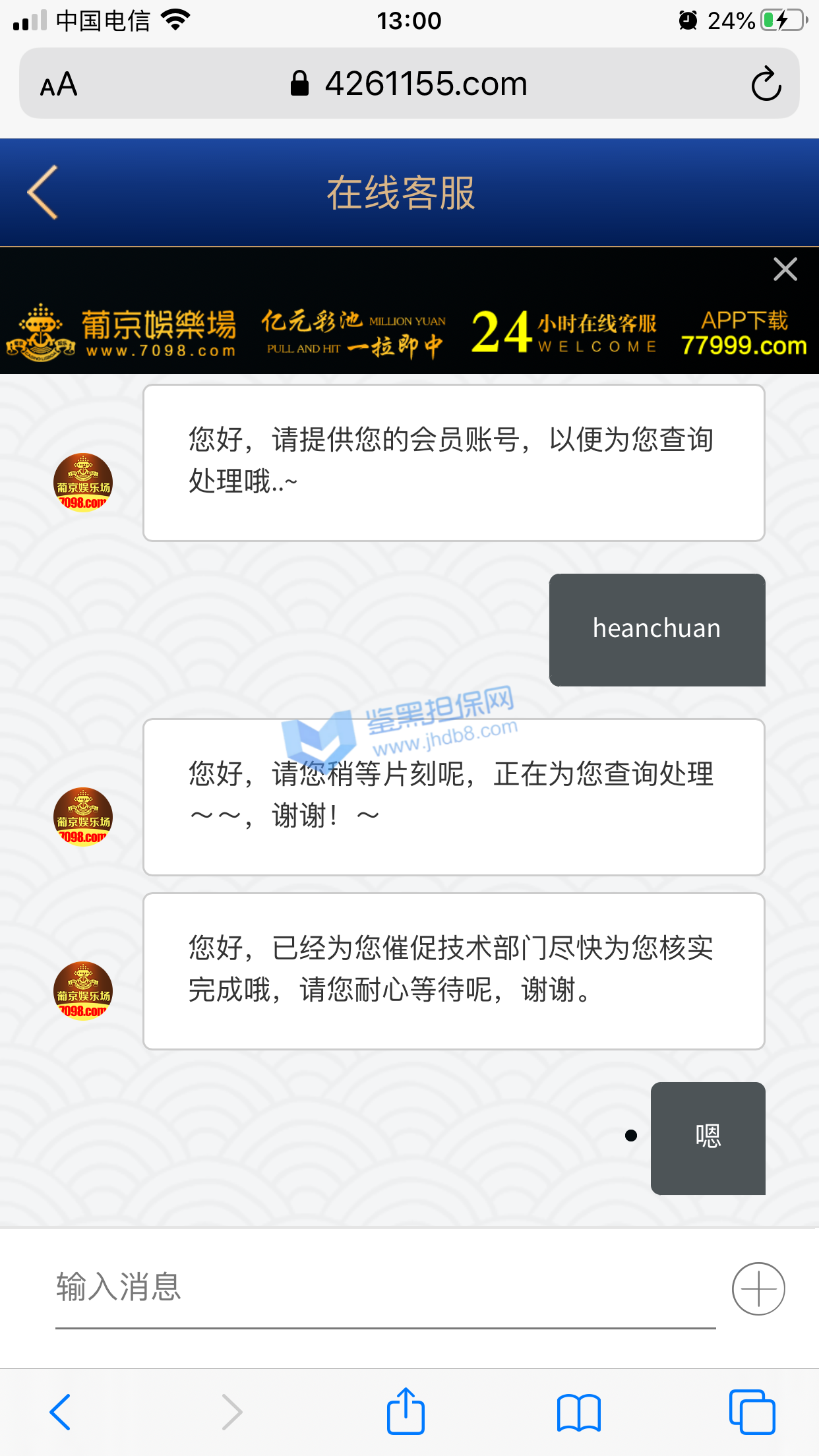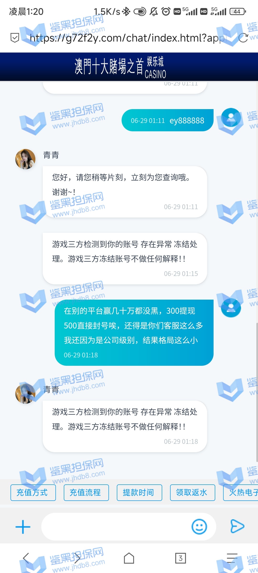 本人账号 ey888888 在6月27日注册的账号,马上就收到了电话回访,说让我参加首存50%,我充值了100领了50输掉了,次日6月28又收到客服电话邀请我再来参加50%,这次充了300 送了150,提现501,先是接到核实银行卡和个人信息,最后说核实完毕,由于我是第一次提现需要把虚拟币的地址发给POP软件的专员,POP这个软件是属于拉黑删除直接自动清空聊天记录的,本人有幸录过充值的视频,请看图1-图3 是和专员客服的聊天记录和充值记录,本人能提供3仅3天的3次的电话通话录音证明是他们电话特邀邀请充值的,本人的确在鉴黑担保网查过他们的官网没有记录当我打开pop聊天软件找专员的时候发个消息在吗聊天记录直接清空了还显示对方不是你的好友,当我重新登录平台的时候显示密码错误,直接修改客户会员的登录密码,找客服就说什么电子套利不做任何解释,本人仅3天都是只用流量进行游戏,玩了MG电子 和PG电子,本人只有一个账号 名下只有一张银行卡,没充值之前一口一个哥哥发那个语音夹子的说,还劳逸结合,有空再来,赢钱了提现直接相当于封号了,次平台多个POP专员 XX001 - XX0012 目前我知道有12个专员XX+后面的数字 001-012排序过去的,估计追回渺茫了,除非鉴黑团队能联系到比客服还高级别的管理。