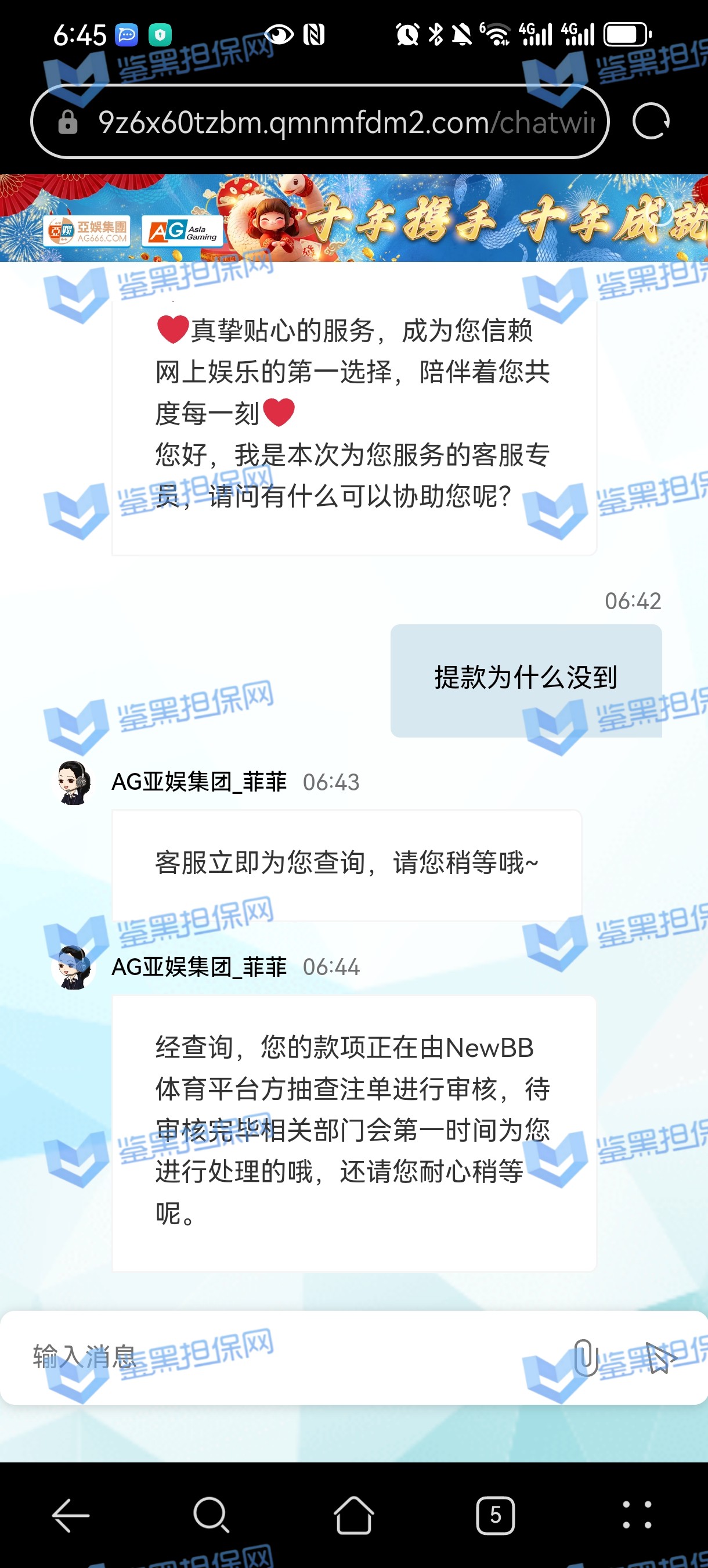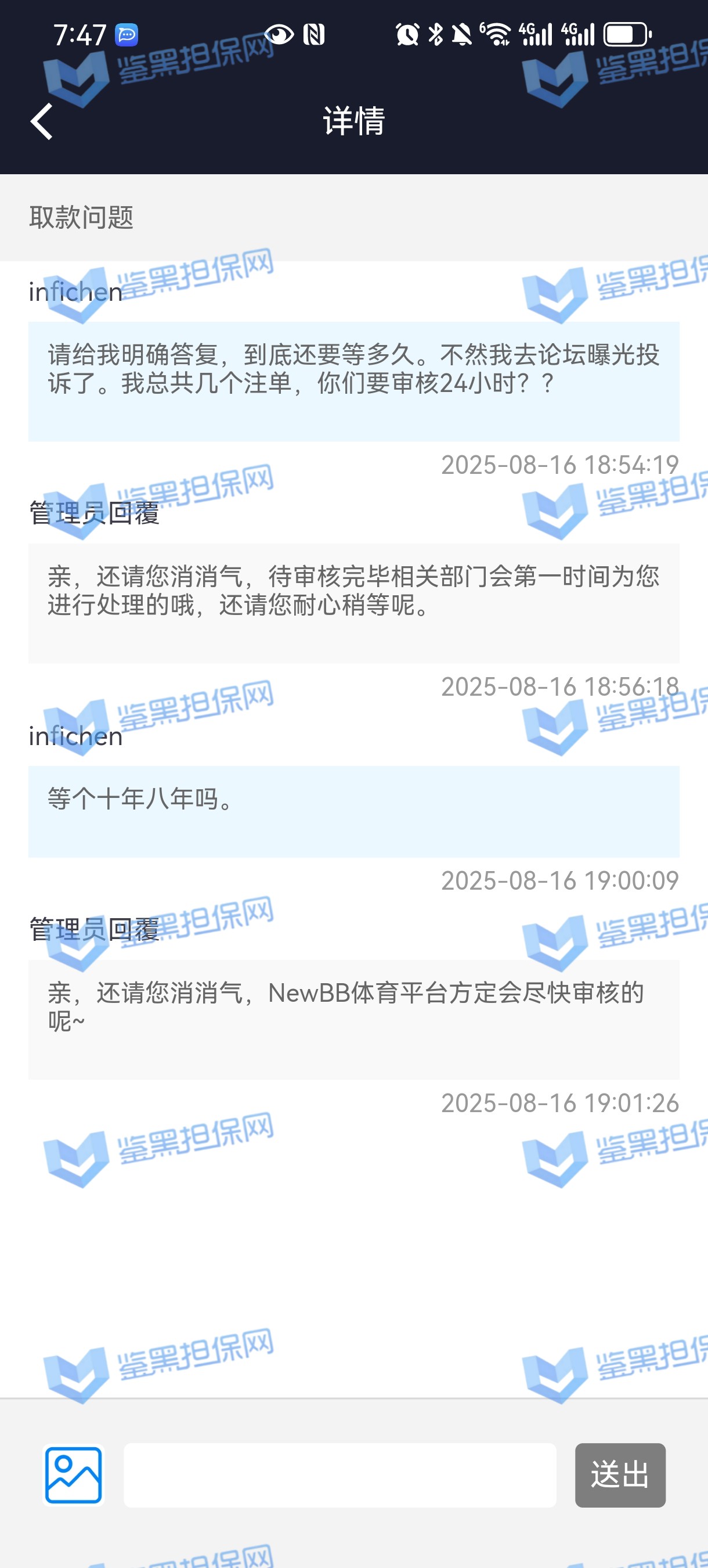 2、鉴黑担保网维权专员联系该平台相关负责人核实情况,对方表示NewBB体育平台抽查审核,需要一定时间,需要等待审核结果,若审核无异常会尽快出款,维权专员多次沟通协商要求催促审核进度,要求重视用户游戏体验以及平台信誉问题,对方说明后表示会再次催促平台,请耐心等待。