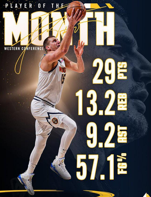 本赛季的第一次西部月最佳奖项,属于掘金的约基奇。这是约基奇生涯第7次当选月最佳。10-11月的比赛中,约基奇场均贡献29.7分13.4篮板9.4助攻1.4抢断,投篮命中率55.3%,三分命中率29%,罚球命中率82.6%。掘金取得13胜6负的战绩,暂列西部第三。掘金官方晒海报祝贺约基奇,并写道:“从他停下的地方继续。”